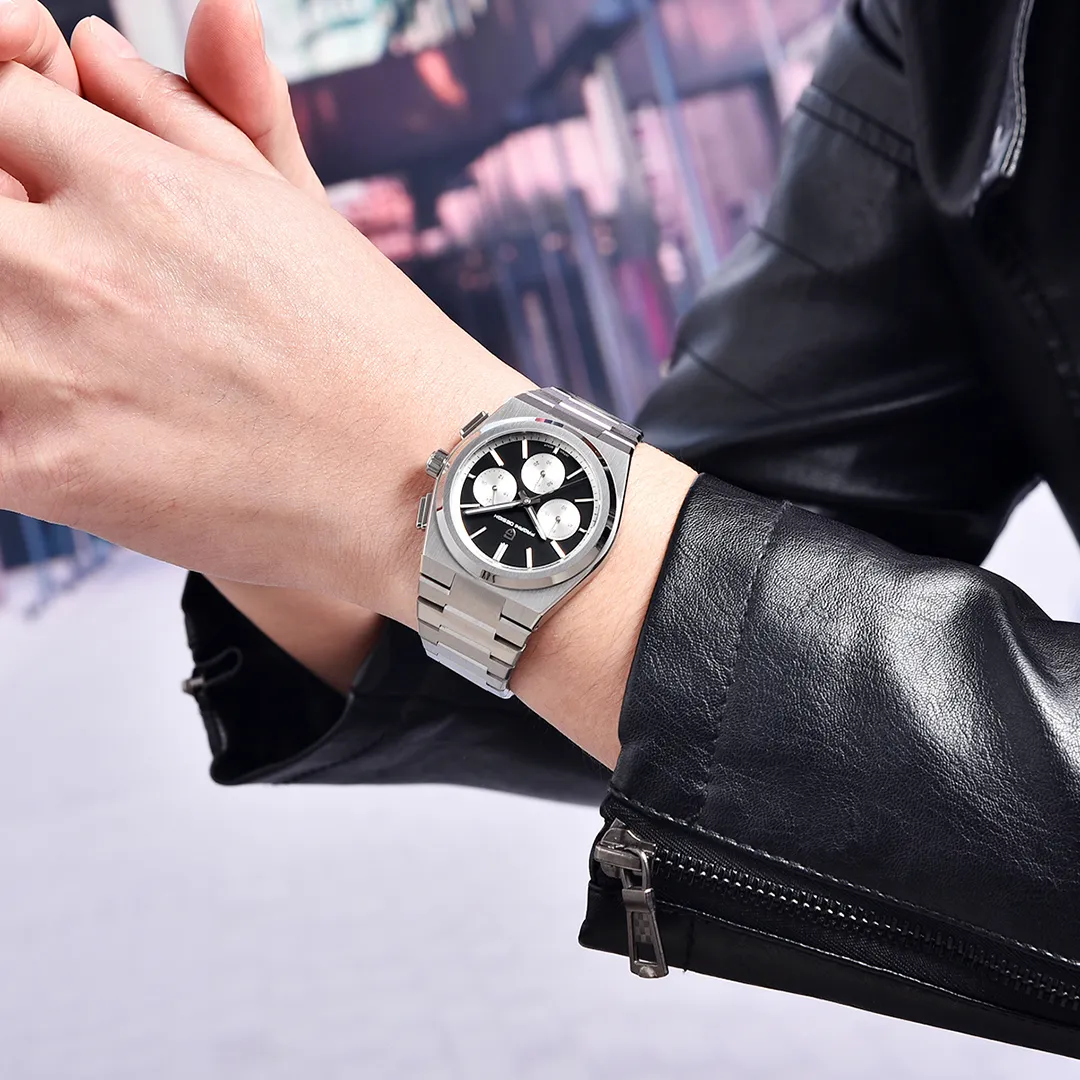 Material: Aço inoxidável, vidro de safira sintética com revestimento AR e movimento de quartzo Seiko VK63 superior